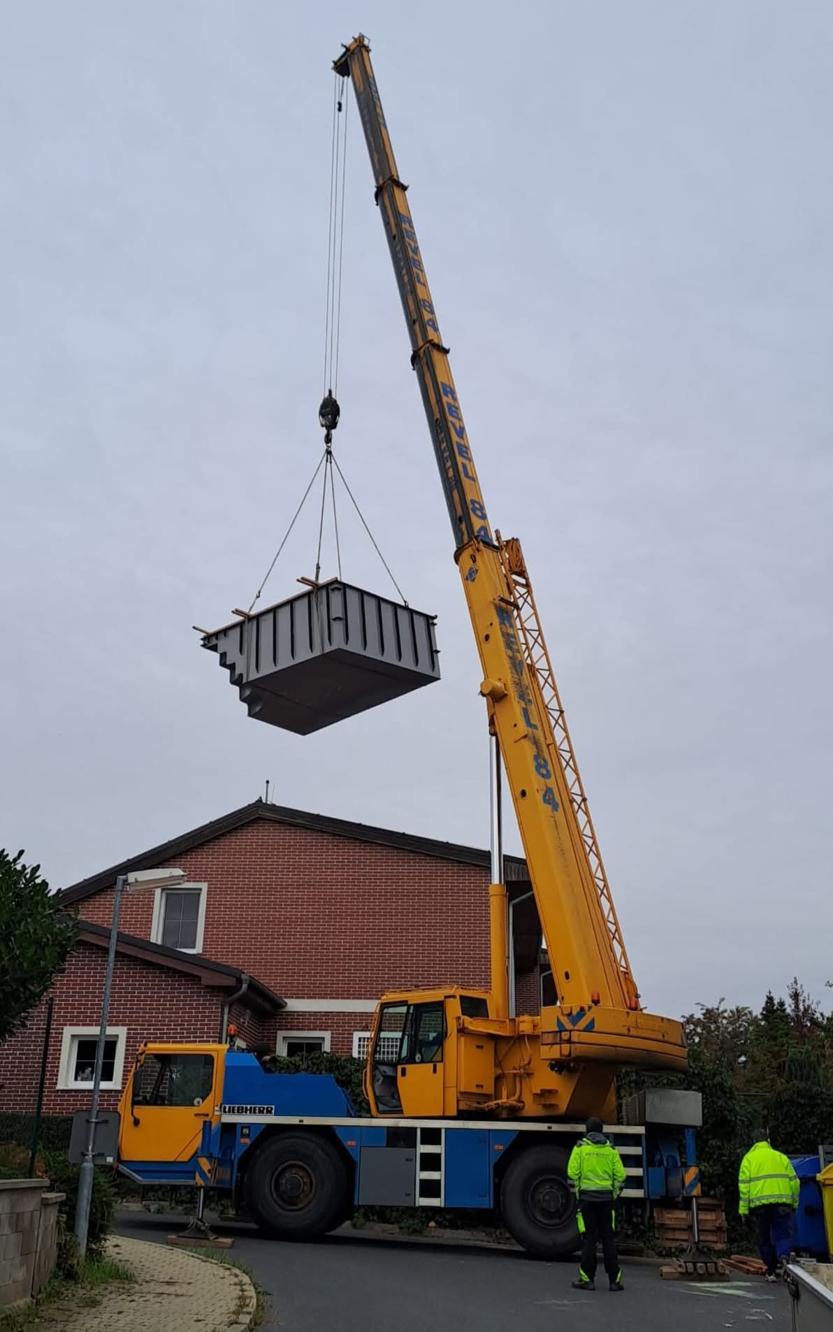 Jediným řešením byl jeřáb. Vše dobře dopadlo a bazén byl usazen.