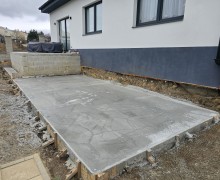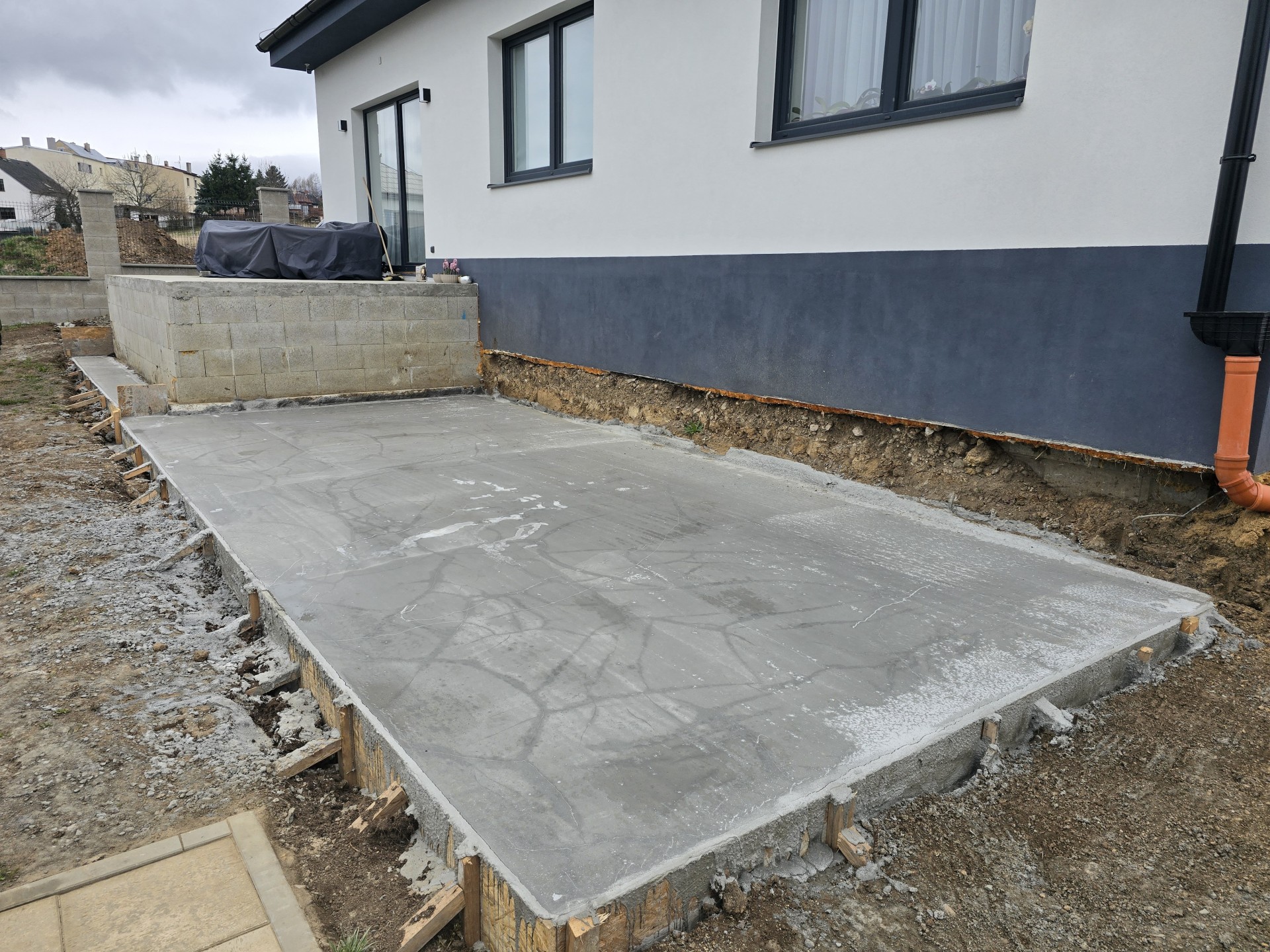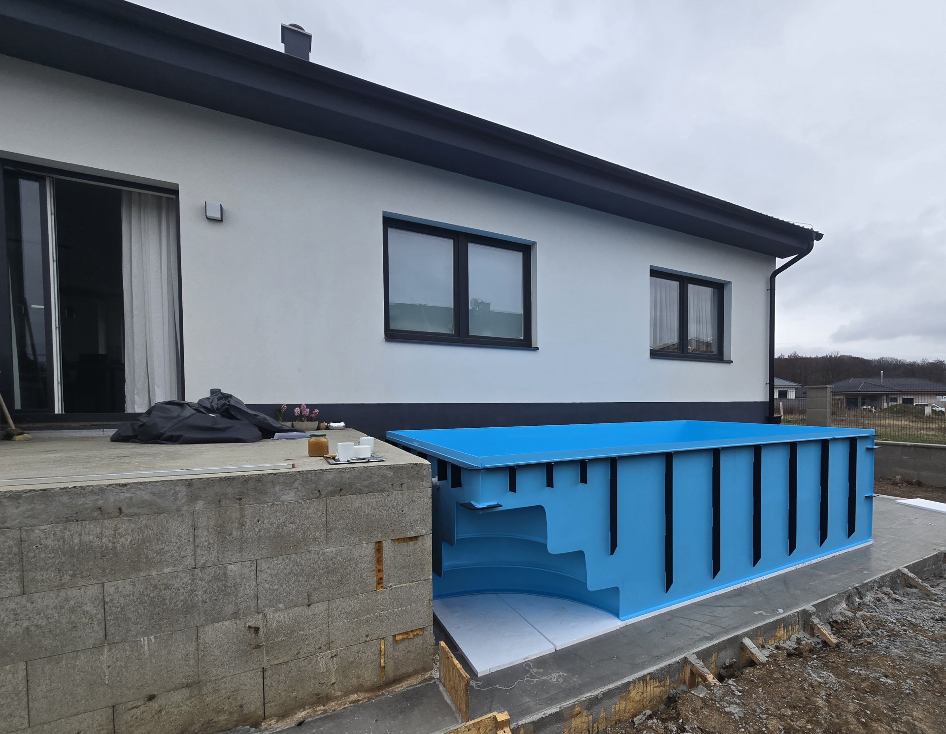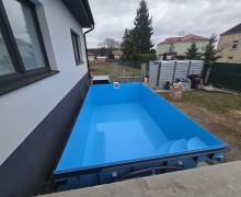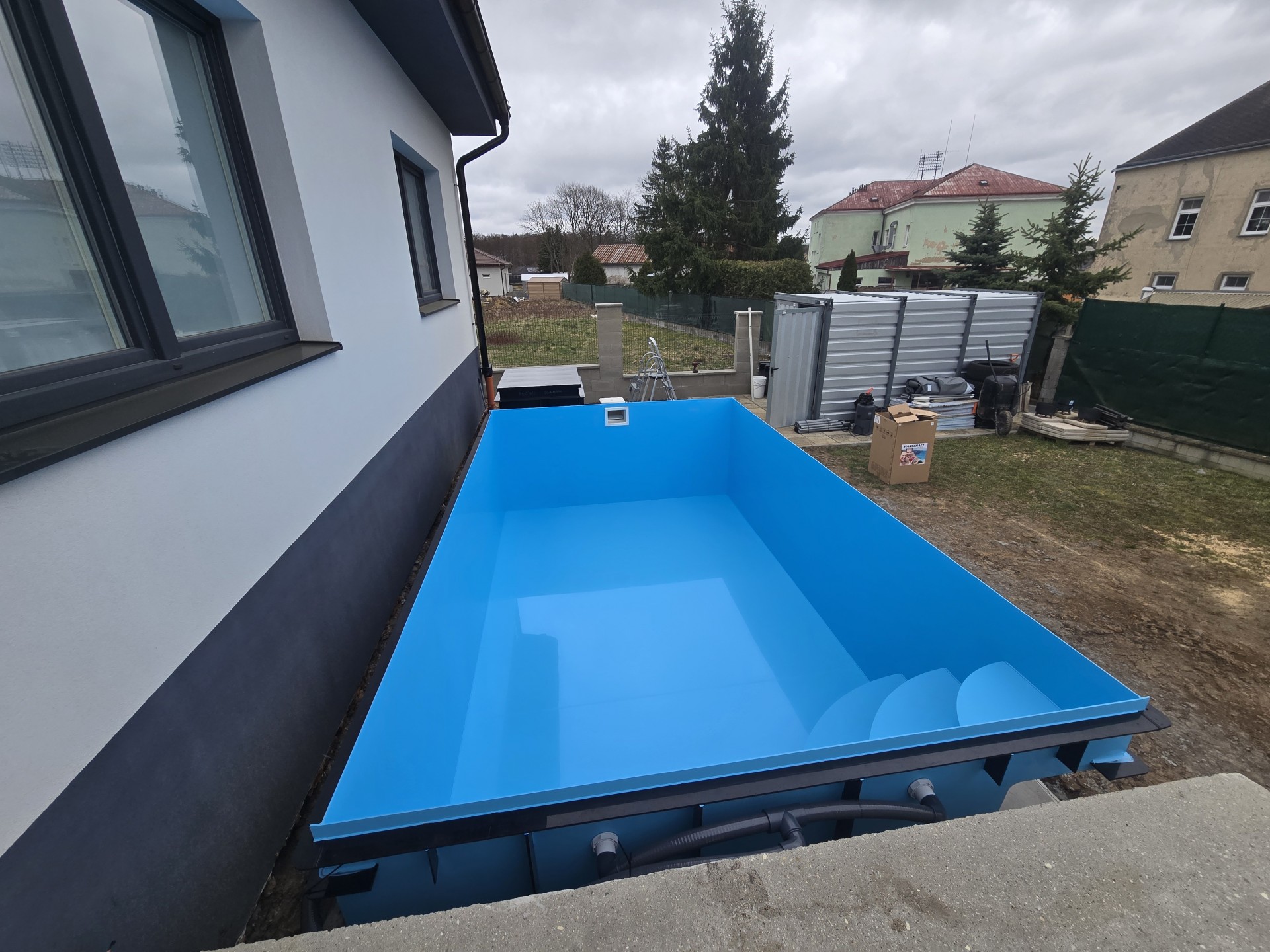 Z hákazní si objednal hranatý modrý bazén na míru 4,5 x 2,7 x 1,2 a umístil ho nad zem zároveň s terasou a vše následně obestaví betonem a kamennou zdí.